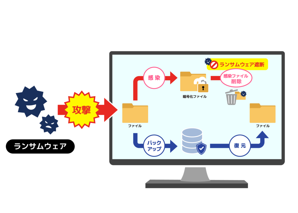 また、暗号化が発生した場合、元ファイルを即座に安全な場所にバックアップし、ランサムウェアを遮断後、正常に復元します。