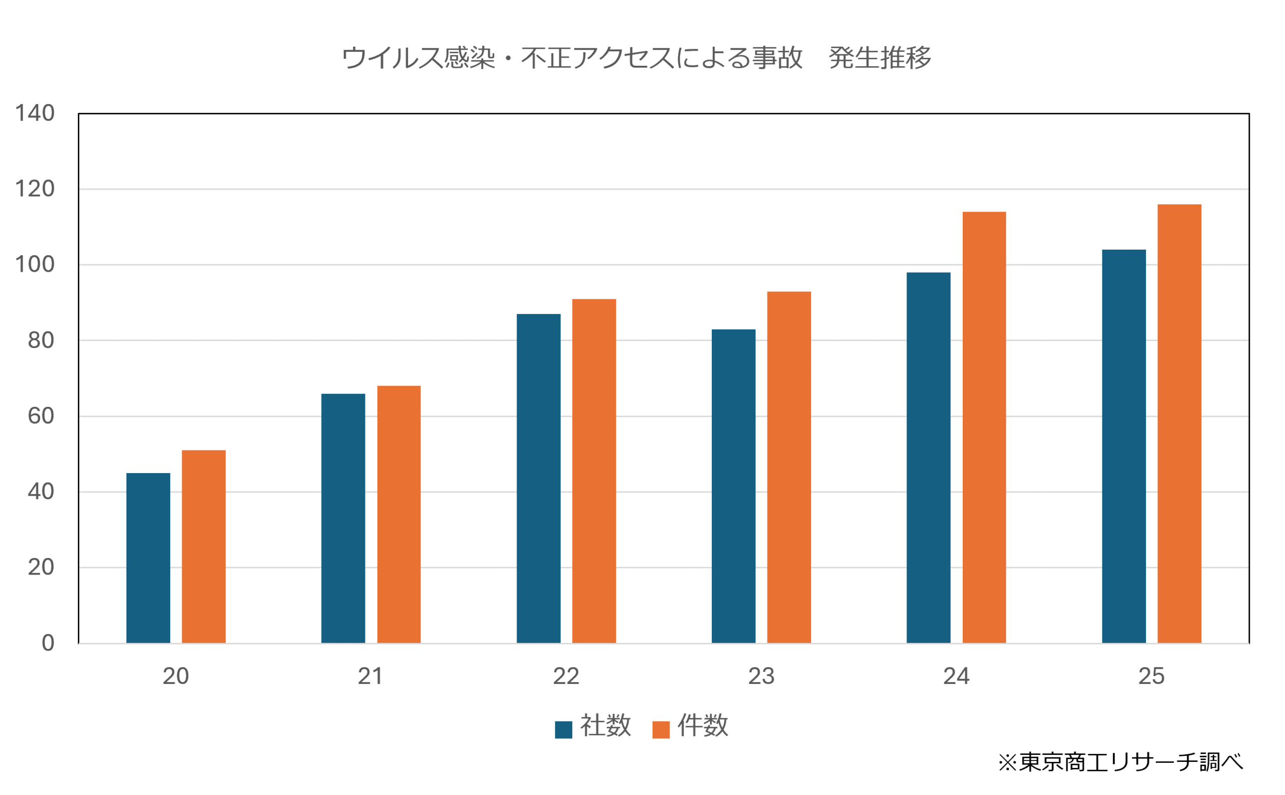ウイルス感染や不正アクセスによる被害件数は右肩上がりで推移しています。